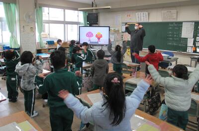1年生は、デニス先生との外国語活動です。からだあそびの歌に合わせて楽しく踊っていました。