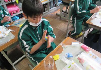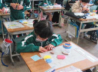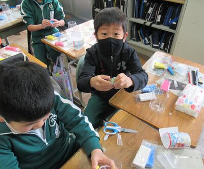 2組は、図工です。紙粘土を使って小物入れを作ります。