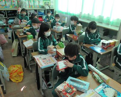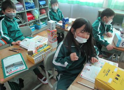 2年生は、算数。家から持ってきた箱の形を見て、仲間分けをします。