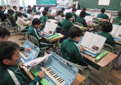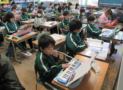 3年生は、音楽。鍵盤ハーモニカの演奏です。