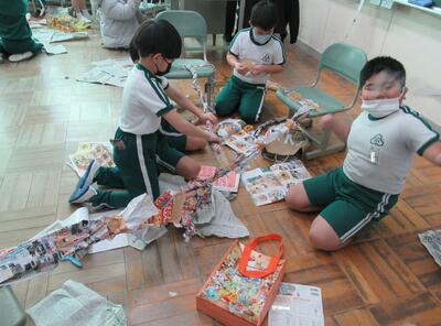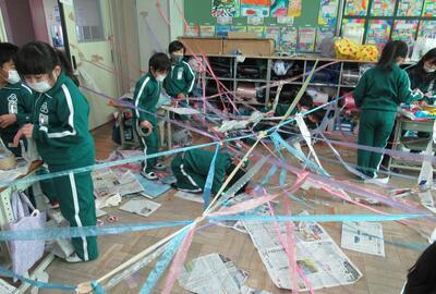 2年生は、図工です。新聞紙やテープをつないだりつるしたり・・・。