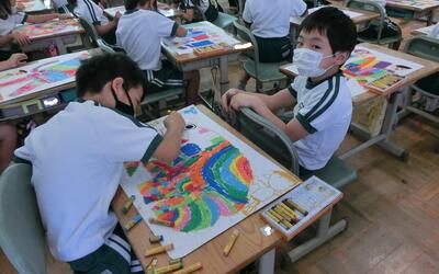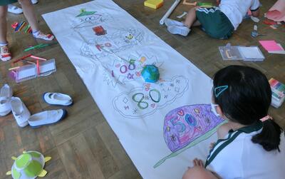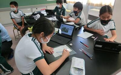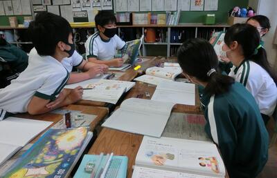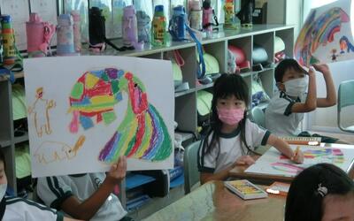 6年生は、ドレイク先生と英語の授業です。植物連鎖のカードを作っていました。