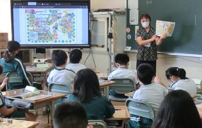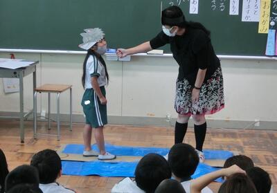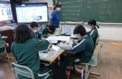 2組では、外国語活動。英語サポーターの先生の発音をしっかりと聞いて発音します。