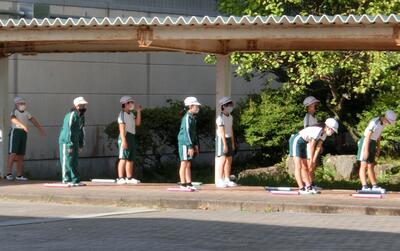 8:00からのドリルタイムの時間は、ラジオ体操の練習(火・木)になります。各学級ごとにいろいろな場所で練習します。