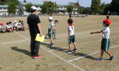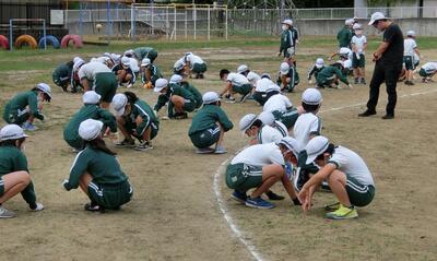 大休憩の時間には、紅白リレーの練習も始まりました。並び方や入退場のしかたを確認します。