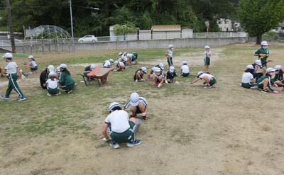 10/2気持ち良い晴天の中、約2ヶ月ぶりに校庭をお借りしての練習ですが、その前にキッカーズ団員・指導者・保護者で校庭を整えさせていただきました。