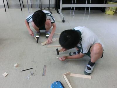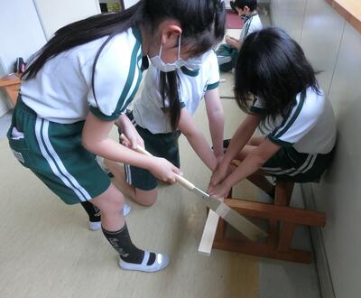 4年生は、図工でギコギコトントン。のこぎりで切ったり、くぎを打ったりして作品を仕上げます。
