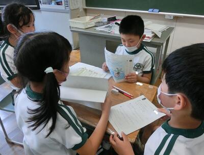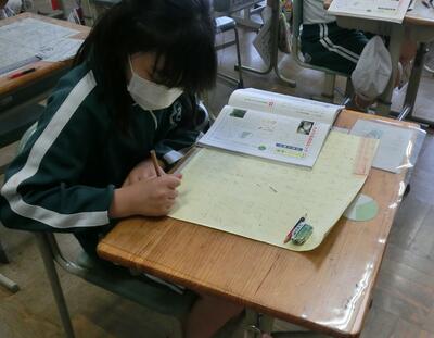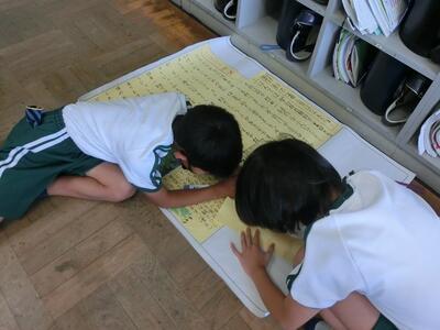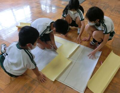 4年生は、壁新聞がだんだん出来上がってきました。それぞれの記事をレイアウトを考えながら貼り付けていきます。