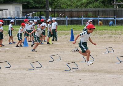 2年生は、校庭で体育です。ミニハードル走です。