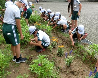 3年生は、花壇の草むしりをしていました。ホウセンカの周りをきれいにします。