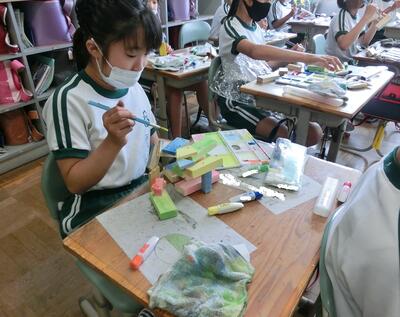 図工では、のこぎりで切り、くぎを打ってできた作品に色をつけていました。