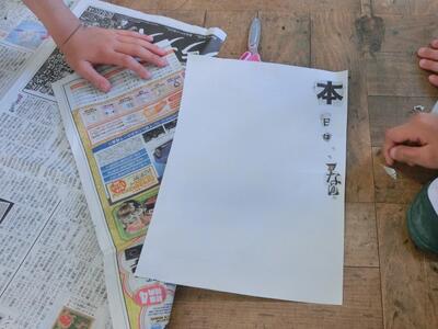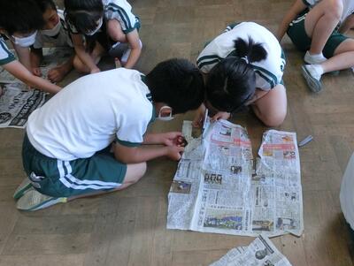 新聞から指定された文字を見つけて切り抜きます。グループで協力しながら探します。