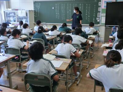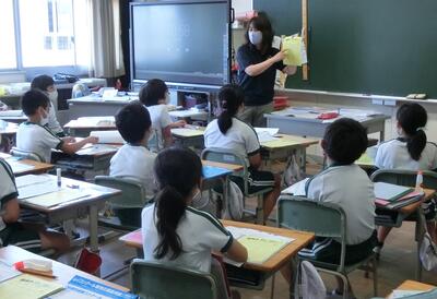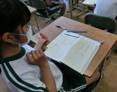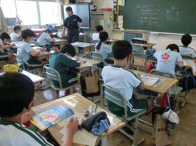 4年生も、夏休みに向けての準備です。先生の説明をよく聞いています。