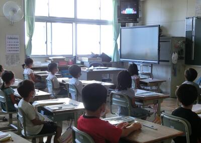 子どもたちは、各教室にてTVに向かって真剣に話を聞いていました。