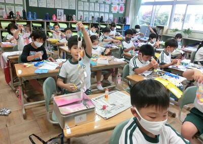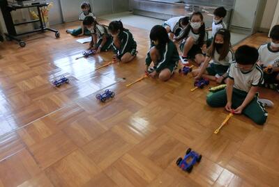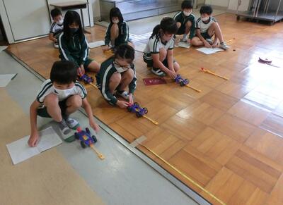 3年生は、理科で「ゴムのはたらき」の実験です。ゴムののばし方によって、車の走る距離がどのように変わるかを調べていました。
