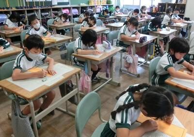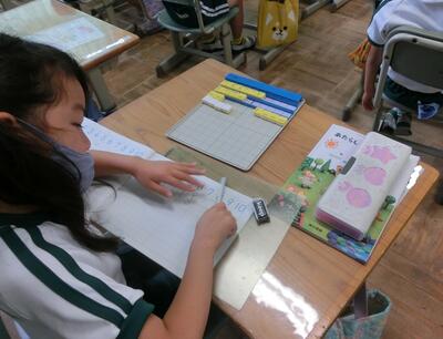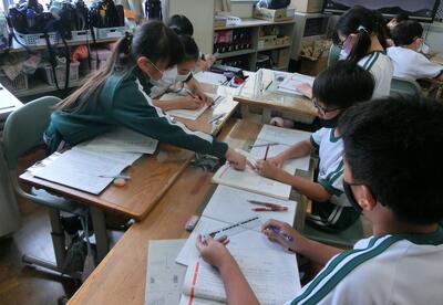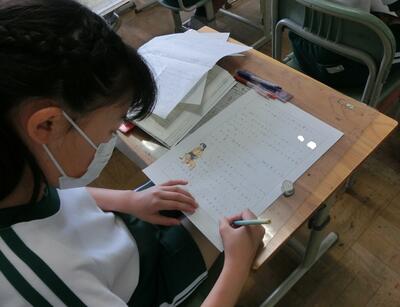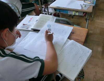 5年生は、国語の報告文の清書をしていました。
