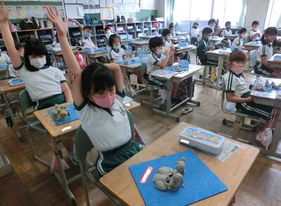2年生は、図工でねんどで作った作品の鑑賞会をしていました。
