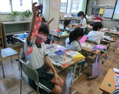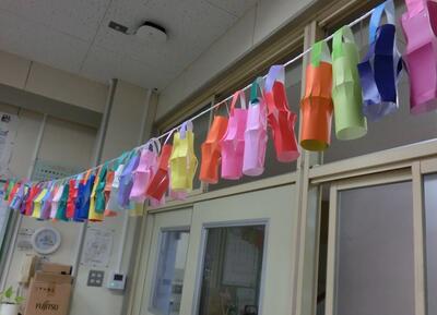 1年生は、七夕かざりを作っていました。ちょうちんなどのかざりがたくさんできました。