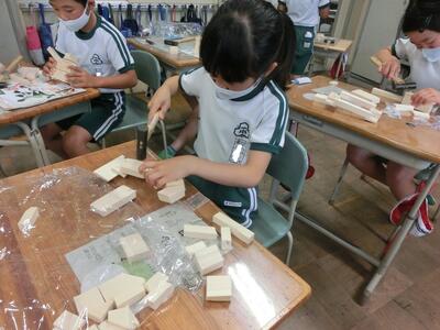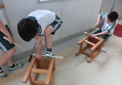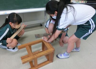 4年生は、図工でくぎ打ちをしていました。いろいろな形に組み立てています。