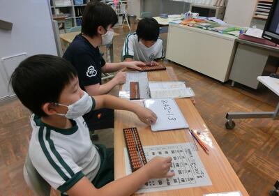 さはこ学級では、そろばんの学習でした。小数のひき算をそろばんで計算します。