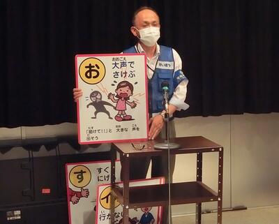 下校中、不審者に遭遇したらどうするか、皆、真剣に話を聞いていました。