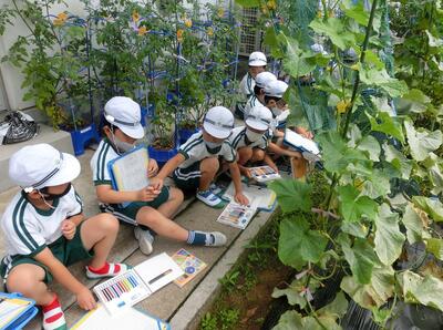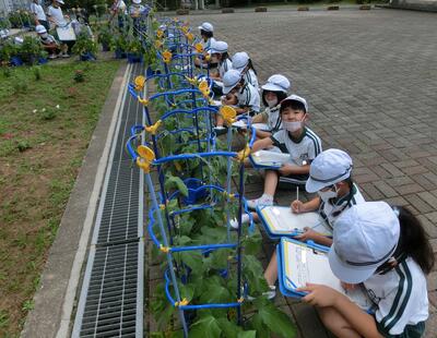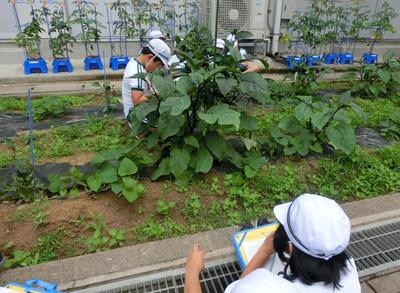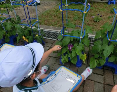 生活科では、野菜の観察をしていました。キュウリ、ピーマンは大きくなり、ナスも実ができはじめました。