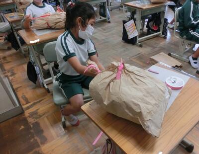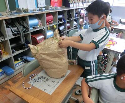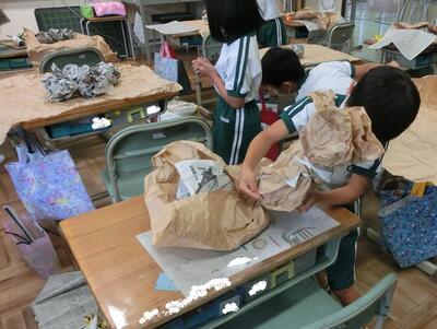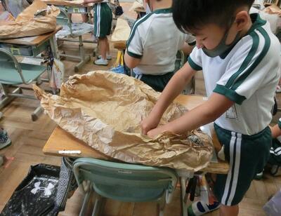 2年生は、図工で大きな紙をくしゃくしゃにしていました。