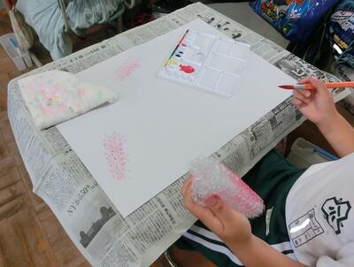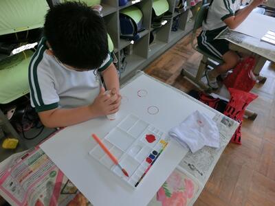 1年生の図工です。カップの底やトイレットペーパーの芯など、いろいろな形のものに絵の具をつけて、スタンプのように色をつけていました。
