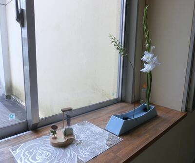 今月の生け花です。校長室前の廊下にあります。