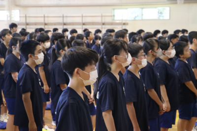 8月26日(月)、第2学期始業式を体育館で行いました。少し蒸し暑かったですが、8月から新たに赴任したALTの先生の紹介と英語弁論大会と駅伝大会、県合唱コンクールの激励会も式終了後に行いました。2学期は長いですが、楽しい行事もたくさんあります。生徒の皆さんの活躍を楽しみにしています。