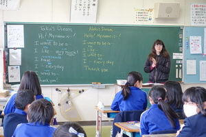 先生といっしょの学習が最後となる6年生は、自分の将来の夢を英語で話す言い方などを学び、友だちや先生にそれを伝えながら交流を持ちました。