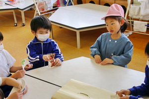 はじめに自己紹介をして、紙芝居を見せたり、自分たちで作ったおもちゃをあげたりしました。