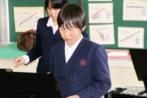6校時目に鼓笛の練習する音が聞こえてきました。しかし、耳に慣れた曲ではなく、今日は新しい曲「スターウォーズ」です。音が聞こえるところを探していって見ると、体育館が卒業式の会場になって使えないため、多目的室のオープンスペースで練習する5年生を見つけました。
