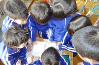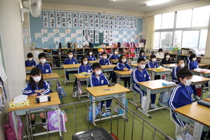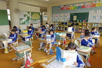 朝、1年生の教室に行ってみると、早く登校して来た子どもから宿題などの提出物をきちんとあげ、みんなで集まって楽しそうにしていました。