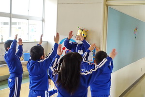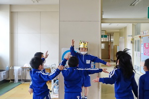 休み時間に1年生のオープンスペースを通ると、冠をかぶった今日が誕生日の児童を中心に集会活動で覚えた「3時のおやつ」ゲームで遊んでいました。