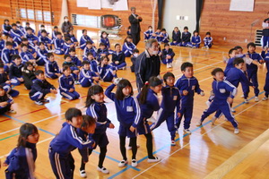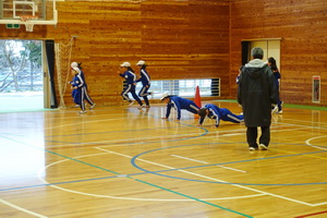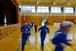 今日の業間体育は、体育館で長縄跳びをしました。