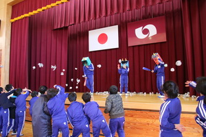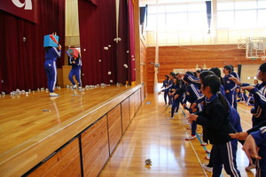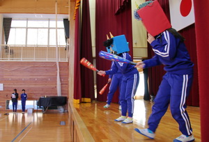 この後、集会委員がふんした鬼がステージに登場し、1クラスごとに豆に見立てた、新聞紙の紙つぶてをその鬼めがけてぶつけました。