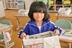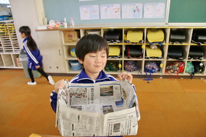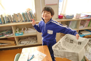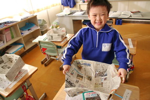 2組では、豆まき集会につかう豆を入れるますを新聞紙でつくっていました。