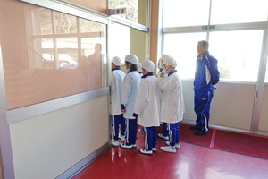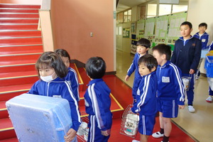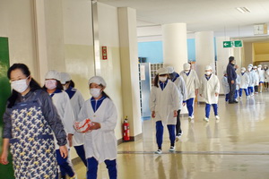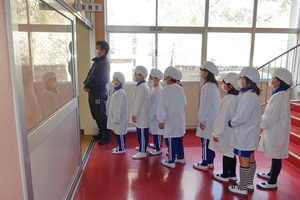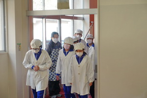 給食当番の児童たちがエプロン姿できちんと整列し自分の役割の物を持って行きます。