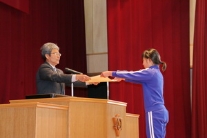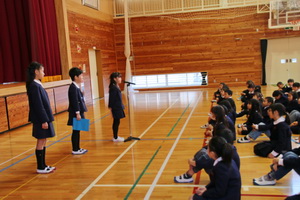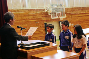 今日の全校集会は、まず市造形展や習字のコンクールの入賞者に賞状の伝達がありました。