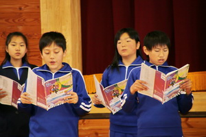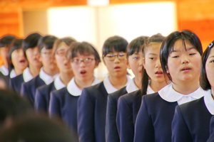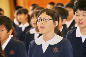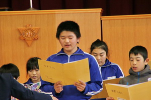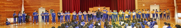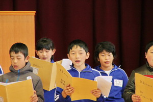 この後、5年生と6年生から下級生に歌のプレゼントがありました。曲目は「花は咲く」です。