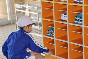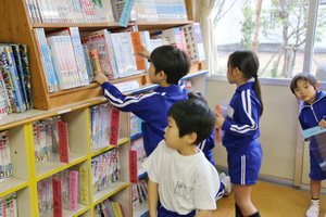 校庭を走り終えた児童は、図書室に行って今日読書する本を借りています。