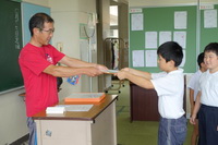 もらったあとはこそっとのぞき込む姿が・・・・。初めてもらった1年生もこれで本当の小学生!??