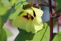 職員玄関前のコットン(島サミットの時に植えたもの)の花が咲き始めました。