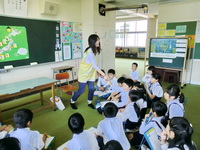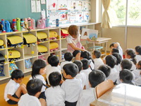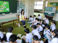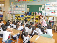 今日のフリータイムには、1年生全員を集めて支援員の先生が本の読み聞かせをしてくれました。