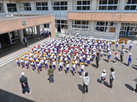 雲一つない空の下、久しぶりに屋外で全校集会が行われました。
