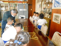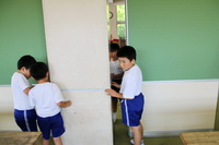 グループごとにまとまって、学校のあらこちらを見て回り、どこにどんな部屋(教室)があるかやそこには、どんなものがあるかなどを調べていました。
