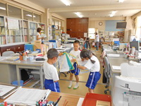 理科室では、5年生の授業の様子を見たり、3年生が育てていて生まれたばかりのチョウをのぞき込んだりしていました。