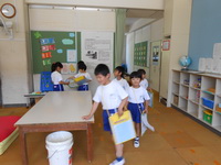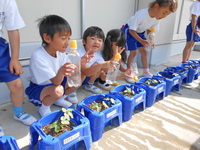 マラソンから教室へ戻ると、うがい手洗いの後、めいめいにペットボトルを利用したじょうろを持って自分の植木鉢へ水やりをしています。