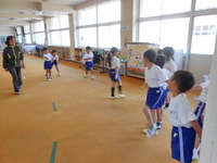 今日は天気のよい1日でしたが昨夜の雨で校庭の状態が悪いためオープンスペースで「だるまさんが転んだ」をやることになったようです。